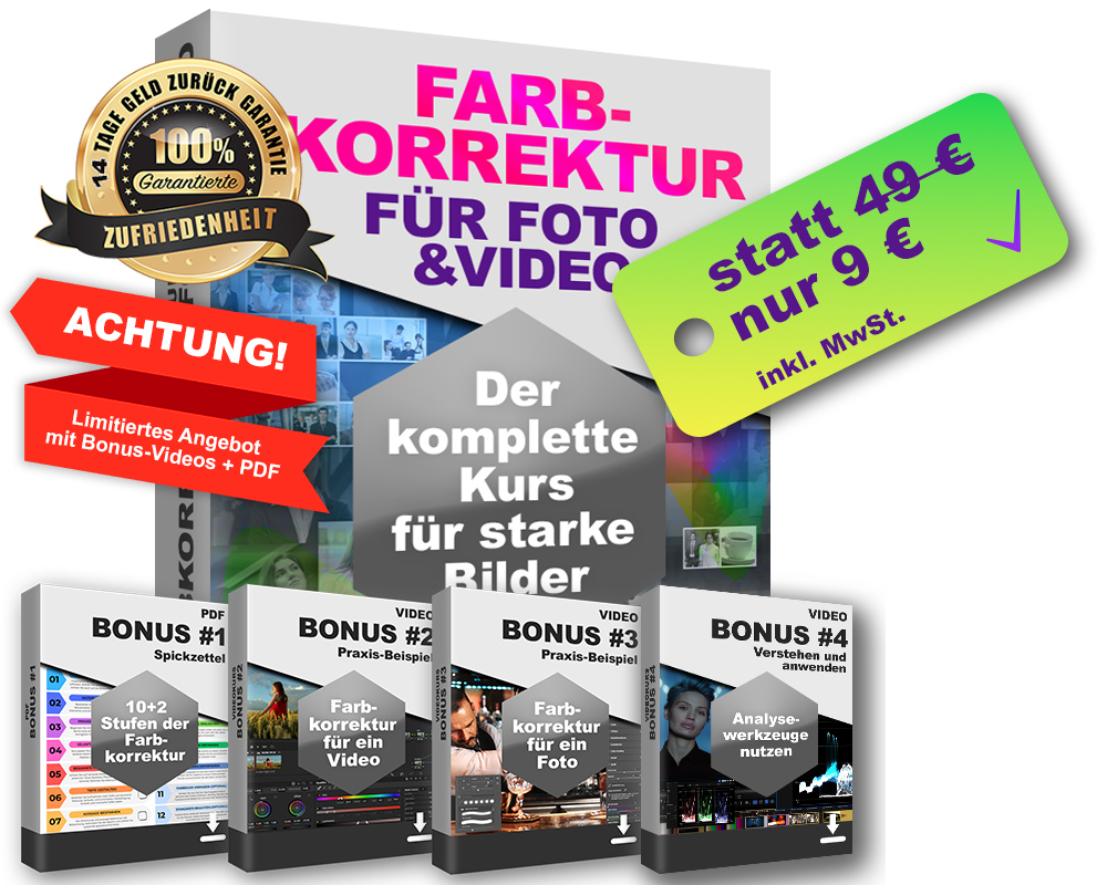 Viele bleiben leider bei der Theorie hängen. Im ➔ Videokurs sehen Sie alle Schritte aus der Anleitung im Detail erklärt und direkt in der Praxis umgesetzt. 👉 Wenn auch Sie die Farbkorrektur sicher beherrschen möchten, ist das der nächste logische Schritt. Hinweis: Dieses Angebot gilt nur auf dieser Seite. Wenn Sie das Fenster schließen, ist der Sonderpreis nicht mehr verfügbar.